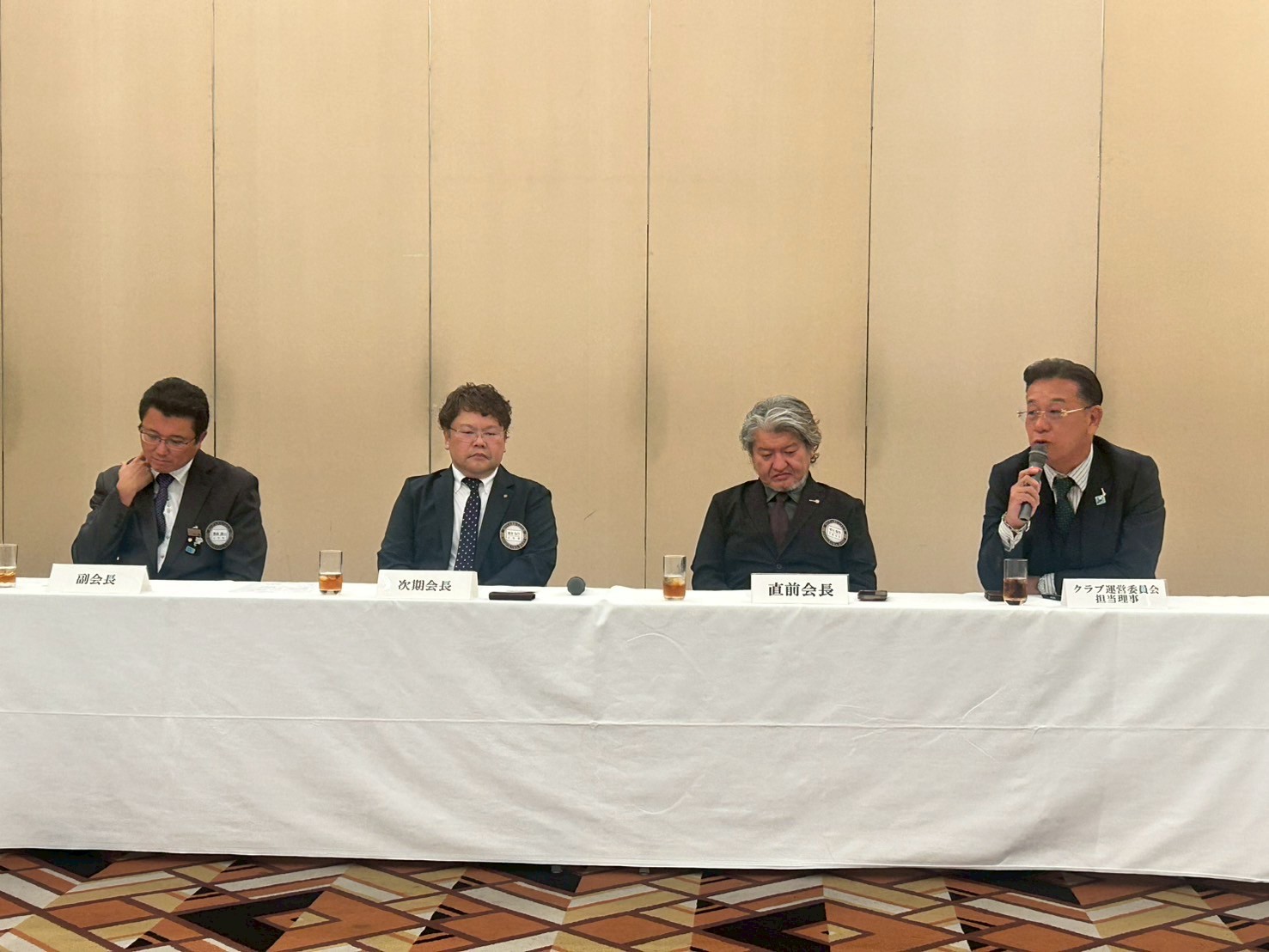 まずは、髙橋会長から本年度のスローガン「Rotary Brand」の原点回帰~クラブの活性化を図り10%の会員増強~元気なクラブへ~について説明を受けた。昔のロータリーの良さ、クラブの元気など原点を見つめ直し、クラブの骨格をしっかりと固めていく1年にしたい。会員数も最高時は120人。現在は45名になっているが、ガバナーの方針のとおり今年は60人、70周年に向けて70人の目標で頑張りたい。10分ほどの熱い語り。私の好きなタイプのロータリーアンだ。菊地幹事は女性で、9年目の会員。会長の方針に従い、副幹事とともに会長を支え、楽しく充実したクラブ運営をやっていきたいとの説明。素晴らしいコンビ。今年の活動にとても期待が持てる。